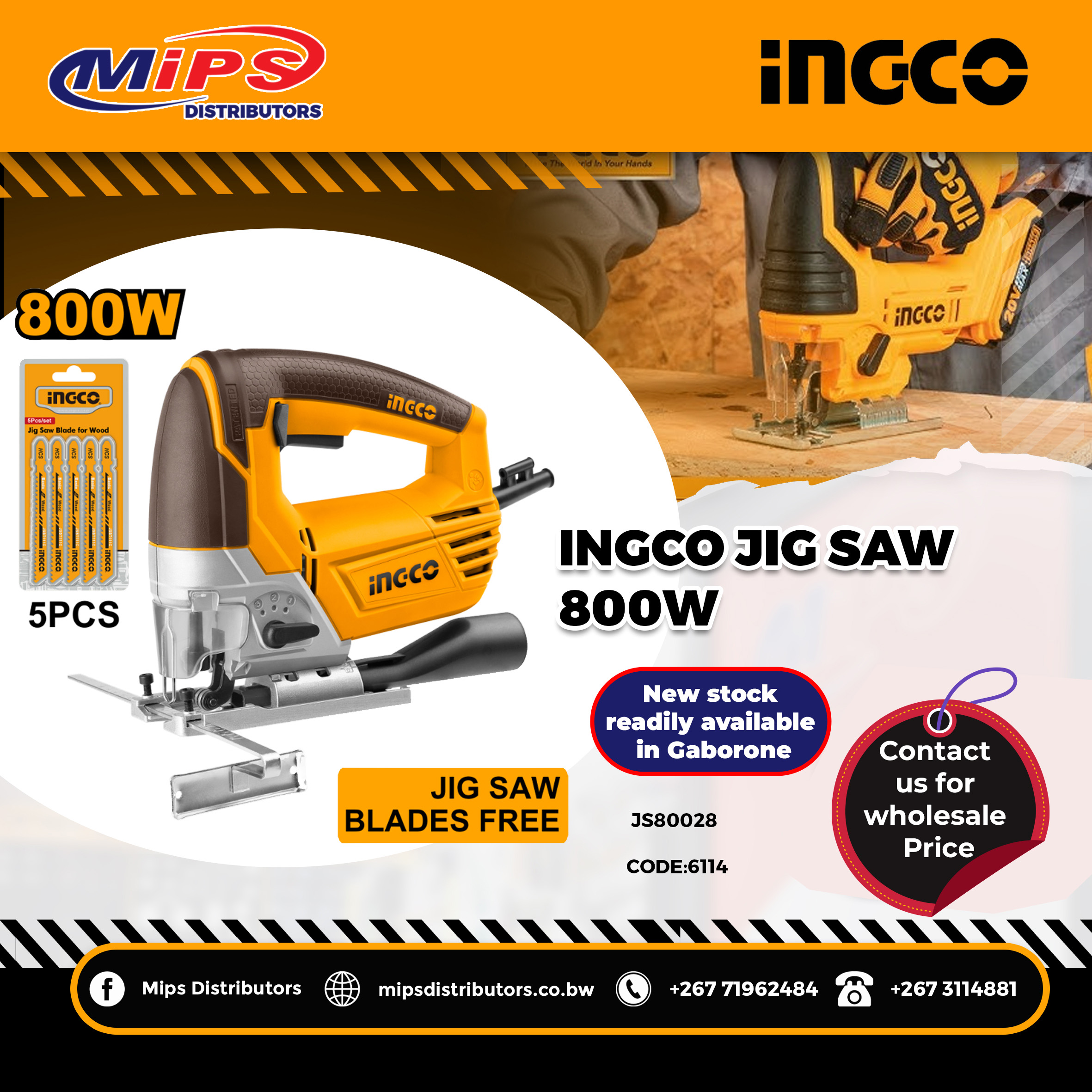 The INGCO Jig Saw 800W (JS80028) is a powerful and versatile cutting tool designed for precision and durability. With an 800W motor, this jig saw delivers strong cutting performance on wood, metal, and plastic, making it ideal for construction companies, carpenters, workshops, and DIY professionals in Botswana.